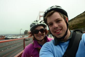 We cycled around towards the Golden Gate Bridge, stopping for photos a few times. We used the gorilla pod to take one of us and the bike, and a lady offered to take a photo when we got to a pier just before the bridge. Whilst at the pier, we had a little sit and a hot dog from ‘Let’s Be Frank’, a hot dog stand - it was very tasty. We then began the cycling part of the journey again.