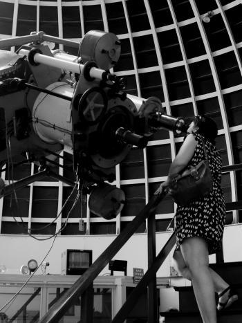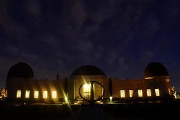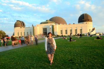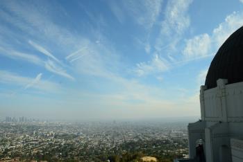 We decided to get something to eat and drink from the cafe, which had a private seating area overlooking the view. We had some crisps, coke, and a Cobb salad to share. The salad included chicken, bacon bits, tomatoes, beans, blue cheese and, of course, salad leaves and a vinaigrette dressing. We ate, drank, and enjoyed the view. Afterwards, we had a look in the shop. It was a little disappointing; there wasn’t very much that was specific to the park. We did, however, buy a few postcards and a badge (sew-on). We then continued to have a look around the observatory. There was some interesting information inside and again nice views from the top. It got late surprisingly quickly and when we next looked, it had gone 6:30 PM. We had noticed that the telescope would open at 7 PM, so we decided to hang around and have a look. After a short queue, we looked through the telescope at Venus, which appeared as a bright white circle. We also looked through a telescope on the front lawn, at the sun, through a special filter. Dani couldn’t see anything, but I saw the bright orange bottom edge. The sun was setting by this time, so we stuck around to take a few photos of the sunset and then some night photos of LA. It was still hazy and, although it looks beautiful with a pinky-purple sky, it looked quite gloomy in the photos. But, well worth seeing all the same!