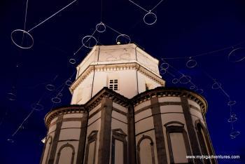 The hotel also seemed to be hosting the Torino football team, as there was their coach parked up outside and people starting to gather. As we headed out for dinner later in the evening, we found that large numbers of people were now surrounding the exit and we had to almost fight our way through the barricades to get out! From there we went for pizza - a place called Pizza ad Hoc, where we enjoyed lovely pizza and beer once again. To burn off some of the consumed calories - and to catch a rather glorious looking sunset - we headed out across the river to the nearby Santa Maria del Monte di Cappucini to see the view back across Turin. It's a fantastic view point across the city which came alive with lights as the sun set. The large tower that can be seen standing high amongst the other buildings is the Mole Antonelliana. It has a glass elevator that you can ride up to see the view across Turin, although we haven't done it yet. We stayed up there for quite a while, watching the lights flickering on through the city, with the sihouettes of the mountains in the distance. And, so to bed.