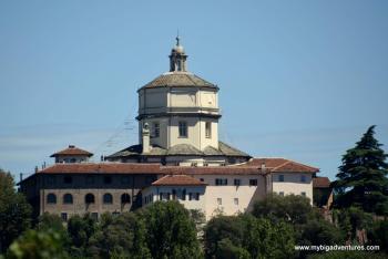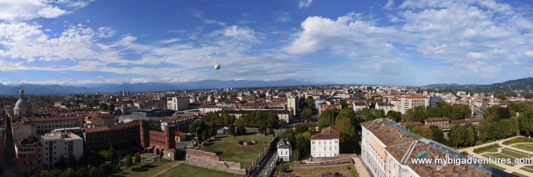 We then headed towards the botanical garden, unfortunately to find it was closed until 3pm. It was, however, next to a rather splendid building, palatial in scale and apparently used by the faculty of architecture but it was originally one of the residences of the royal house of Savoy. Having spent several hours wandering around the park, we decided to return to the viewpoint at Monte de Cappuncini across the river, as it was nearby and a very clear day. It was quite hot at this point, so we walked gently, particularly as we were going uphill. Made it to the viewing platform and although there were a few other people, it was characteristcally quiet. Both the church and the museum (for mountaineering) were open, so we popped into the church - Santa Maria del Monte - for a quick look. It had a very tasteful ceiling - lots of domes and small windows in the main dome, creating an effective light pattern. Took quite a few photos of the view outside, including the Alps and the distant fixed hot-air balloon attraction. Unlike our previous trip up at night, the mountains were really clear, showing a few snow caps in the far distance. After a sit and several trips to the water fountain to refill our water bottle, we headed back down the hill, not getting very far before having to go back to search for my sunglasses, last seen in the church... (found them!)