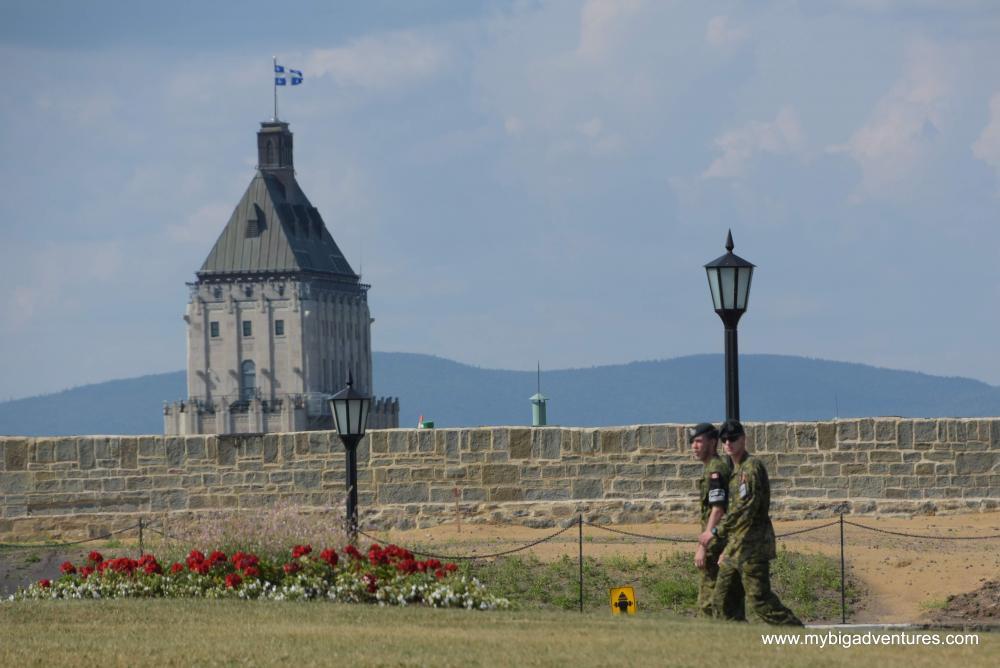 We walked all the way to the top taking in the views back across the city and the surrounding areas. We had an ice-cream, that quickly melted (halfway down my arm) so I ate it in record time before it made too much of a mess. We continued on, reaching the citadelle, which is still an active military base and home to the 22nd Regitment and official residence of the Givenor General and should she wish to use it, the Queen. You can get tickets to tour inside the residency or around the military base, with either giving you access to the museum. We opted for the tour of the base, and were taking around by Anthony who as it turned out was a teacher on his school holidays. He was really knowlegable and gave us a brief history of the regiment and took us around many of the key buildings - stopping in the shade where posible as it was really hot. One of the stops on the tour was the Kings Bastion which offers some of the best views across Quebec and a great place for photos.