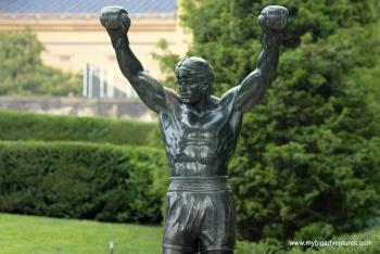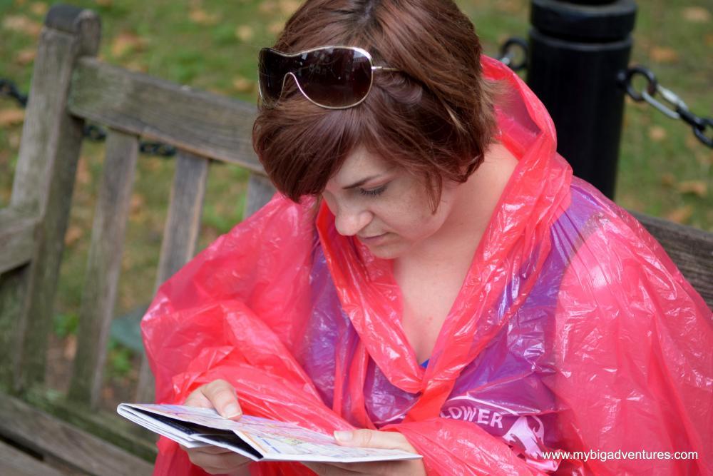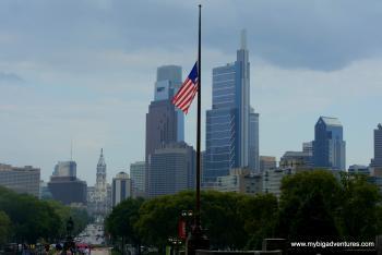 From there we wandered towards Fairmont park, immortalised because of the 'Rocky' steps that lead up to the Philadelphia museum of art that's near the bottom of the park. We walked up the steps - we could have run to be like Rocky, but no! - and had a little sit on a bench at the top. It started to rain a little bit so we had to put ponchos on but it passed over, so we 'de-ponchoed'. We decided to walk into the rest of the park and, as we were going down the steps, it started to rain again, so we 're-ponchoed'. But this time, it didn't stop. In fact, it rained more. And more. We ended up having to rush back up the steps and under the shelter of the museum, running through the flash flood water so we were pretty soaked by the time we got there. Thankfully it passed over again, so we decided to head back to the hotel. We waited for the Phlash again and were lucky to get on it before the heavens opened. It was a deluge! The bus saved us a fair bit of walking but we still had to walk a bit and the bus also stopped just before a river running down the street - so any part of our feet that weren't wet before, were certainly wet now! When we got back to the hotel, we muct have resembled drowned rats!