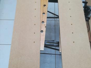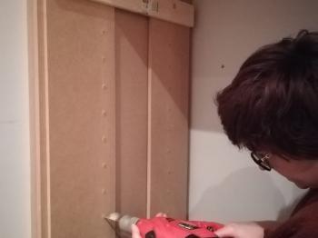 Today we made a start on the shelves inside the new cupboards. The shelf supports we bought from Screwfix are the same sort that you use inside kitchen cabinets and are designed to be adjustable. I liked the idea of being able to set the shelves at different heights so in order to drill the holes inside the cupboard we made another jig out of some spare wood. Once complete we set about drilling the shelf holes.