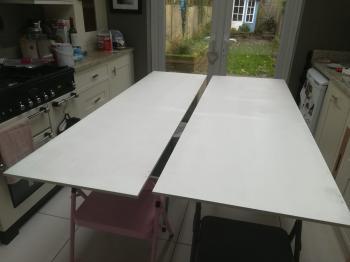 Now it was time to start painting. We stopped by Screwfix again to buy undercoat paint for all of the MDF, then took the doors off the units and got started. Dani made a start with the white emulsion, painting the ceiling, whilst I made a start undercoating the doors. The doors took two coats of undercoat on each side and with 8 doors to paint for this unit alone, it was looking like a big job.