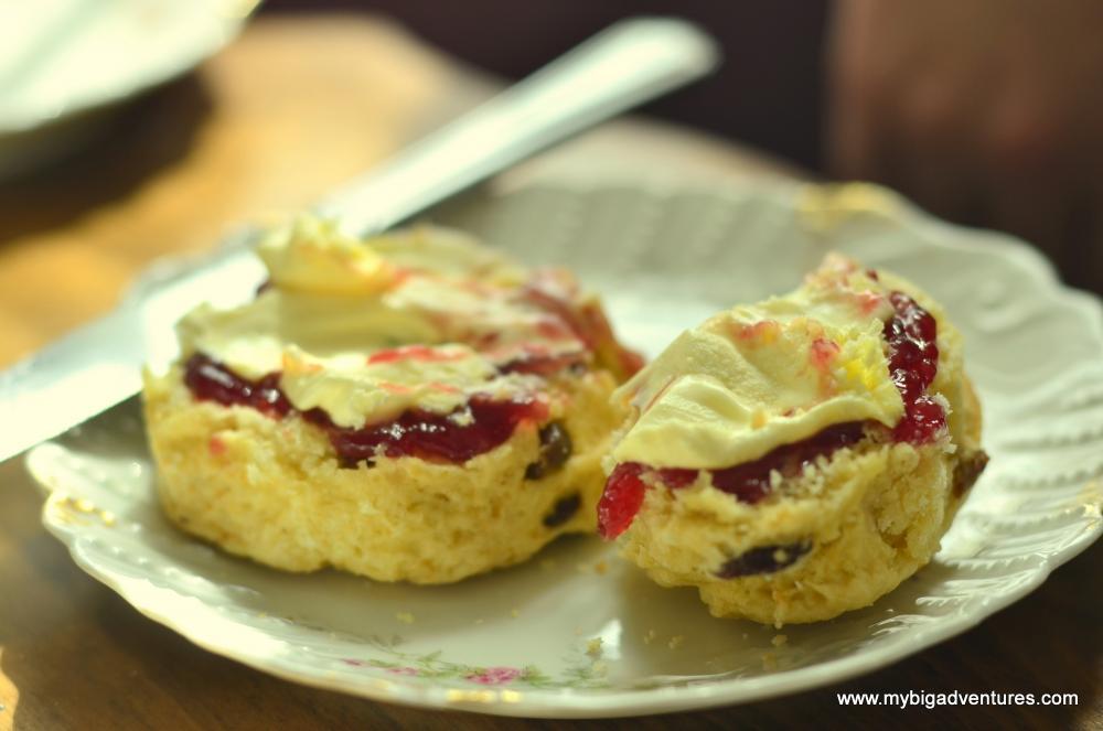 From there, we went to Claife viewing station, a castle-style tower, constructed to offer lovely views over Windermere, with coloured panes of glass to look through. Apparently, it was linked to the Picturesque movement - as it offered perfectly composed views of the lake. However, it was risky to offer the public such views as they might be overcome by the perfect beauty and faint... Risky business, looking at views... Getting peckish after all the perfect views, we decided to have lunch in the cafe. We shared a ploughan's sausage roll picnic lunch (with some cheese, cherry tomatoes and chutneys) and a scone with jam and cream.