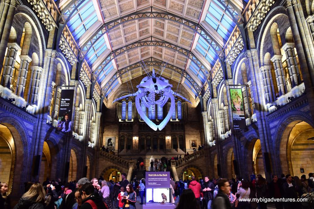 From there we went into Wetherspoons for a tea, as it was quite cold and we needed a pick-me-up. We sat nursing hot drinks for a while and then made our way across town. It was very busy out and about - so many tourists wandering about! We ended up going to the Natural History Museum, and we had a little look at the ice-skating out the front, and the pretty lights! We then thought we'd go in - there was a couple of hours until closing - and we hadn't seen the newest addition of the blue whale skeleton hanging in the main hall. Plus, there's the dinsoaurs...