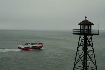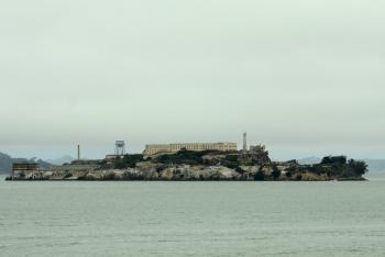 It had dropped colder, so we stopped in the Alcatraz cafe for a cup of tea. We waited till about six - our boarding time - and were surprised to see a lot of people already queueing. Seemed odd, but showed our tickets and joined the line. Had an obligatory photo taken, in front of an image of Alcatraz, which you could buy later for ‘only’ $22. Got aboard the boat and set sail. The fog had crept in, so the coastline looked quite eerie.
