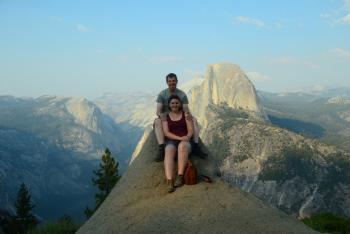 We’d already decided that we wanted to go to Glacier Point next, via Tunnel Viewpoint. This involved a drive. And a much longer one than we expected, as it turned out! We stopped a couple of times along the way, including at Tunnel View, which offered fantastic views across the park. The car park at Tunnel View filled up shortly after we arrived, with a number of coach parties and we left just before we got blocked in by another coach. The drive to Glacier Point took much longer than expected, due to the slow winding roads, but we did see a wolf by the road on the way, which was fantastic. We stopped at a viewpoint shortly before Glacier Point which was pretty busy. Somebody offered to take a photo of us sitting on a rock against the panorama, which was nice. We also saw some more of the blue birds we’d seen earlier and took some more pictures before heading back along the winding roads.