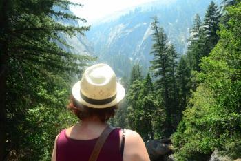 It first involved catching one of the shuttle buses that run around the park. The shuttles take you to the main trail heads around Yosemite village. We caught the shuttle to stop 16 and when we got there we thought we better eat the crisps we were carrying, having read warnings about carrying food (due to bears). We also bought some chocolate cookies from the food kiosk and filled the water bottle from the water fountain. Finally, we got going on what turned out to be a much more strenuous walk than we had anticipated! It took about an hour and a half, walking uphill all the way, with a few stops for water and to catch our breath. We saw a little lizard darting about and a pretty impressive butterfly, and lots of little squirrels. Close to the top, when we were having a rest, a boy came past on his way down and cheerfully told as it wasn’t much further - we must have looked like we were on the verge of giving up (we were)!