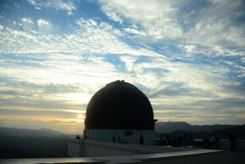 We decided to get something to eat and drink from the cafe, which had a private seating area overlooking the view. We had some crisps, coke, and a Cobb salad to share. The salad included chicken, bacon bits, tomatoes, beans, blue cheese and, of course, salad leaves and a vinaigrette dressing. We ate, drank, and enjoyed the view. Afterwards, we had a look in the shop. It was a little disappointing; there wasn’t very much that was specific to the park. We did, however, buy a few postcards and a badge (sew-on). We then continued to have a look around the observatory. There was some interesting information inside and again nice views from the top. It got late surprisingly quickly and when we next looked, it had gone 6:30 PM. We had noticed that the telescope would open at 7 PM, so we decided to hang around and have a look. After a short queue, we looked through the telescope at Venus, which appeared as a bright white circle. We also looked through a telescope on the front lawn, at the sun, through a special filter. Dani couldn’t see anything, but I saw the bright orange bottom edge. The sun was setting by this time, so we stuck around to take a few photos of the sunset and then some night photos of LA. It was still hazy and, although it looks beautiful with a pinky-purple sky, it looked quite gloomy in the photos. But, well worth seeing all the same!