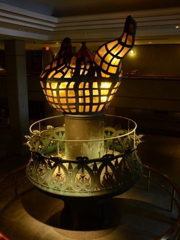 Anyway, snapped out of being grumpy and went on into the museum. You went in past the original flame from the statue, which was replaced in the 80s, as it was corroding badly. Originally, it had little tiny panes of yellow glass – a bit like leaded lights – and it was lit from within. But, it still didn’t light up powerfully enough, so, when it was replaced, the restorers went back to the original plans and made one to be gilded instead, rather than lit.