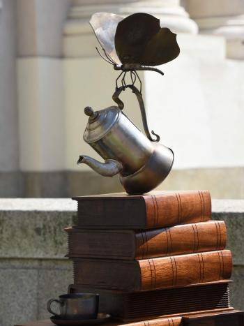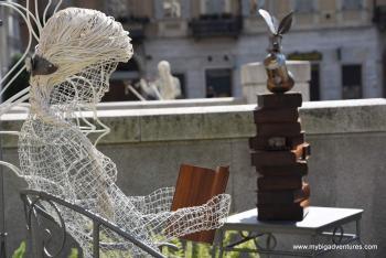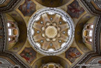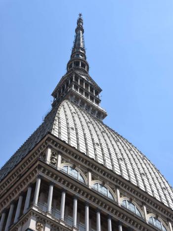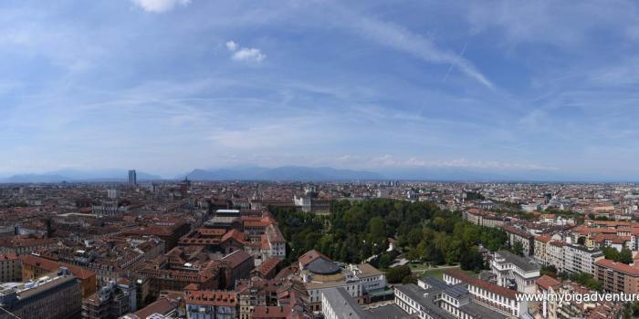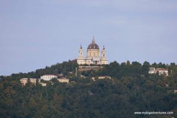 We then headed towards the botanical garden, unfortunately to find it was closed until 3pm. It was, however, next to a rather splendid building, palatial in scale and apparently used by the faculty of architecture but it was originally one of the residences of the royal house of Savoy. Having spent several hours wandering around the park, we decided to return to the viewpoint at Monte de Cappuncini across the river, as it was nearby and a very clear day. It was quite hot at this point, so we walked gently, particularly as we were going uphill. Made it to the viewing platform and although there were a few other people, it was characteristcally quiet. Both the church and the museum (for mountaineering) were open, so we popped into the church - Santa Maria del Monte - for a quick look. It had a very tasteful ceiling - lots of domes and small windows in the main dome, creating an effective light pattern. Took quite a few photos of the view outside, including the Alps and the distant fixed hot-air balloon attraction. Unlike our previous trip up at night, the mountains were really clear, showing a few snow caps in the far distance. After a sit and several trips to the water fountain to refill our water bottle, we headed back down the hill, not getting very far before having to go back to search for my sunglasses, last seen in the church... (found them!)