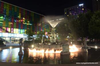 We had tea at a French/Canadian restaurant called Holders. It was really busy, but we were seated straight away. I had the beef bourguignon and Dani had confit de conard. It was very nice, and we shared a chocolate mouse for dessert. Afterwards we walked back towards old town to take some photos. The basillica was nicely lit and there was an animated film playing on the side of the building next to the bank. We walked along the yellow route looking at many of the other buildings that were also lit, back near the hotel we came across a water feature that seenmed to be on fire. It turns out that it's an installation called the 'La Joute' by Quebec artist Jean-Paul Riopelle. Every hour the fountain comes to life with a ring of fire surrounding it before being doused by the water fountain. We only caught the end, so dropped our stuff at the hotel and then went back out to see the next cycle from the beginning. By the time we got to the hotel it was gone 11 so we called it a night. We're going to have have a look at the parks tomorrow.