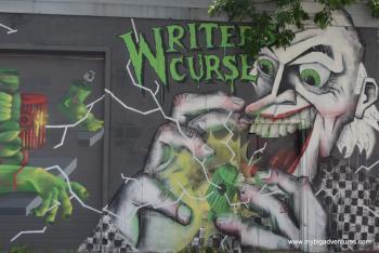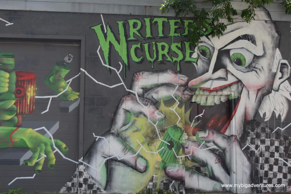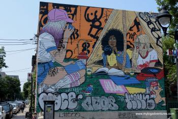 We got up a little later than usual today - I think the warm weather is wearing us out! So we decided to get brunch instead of breakfast. We went to a relatively nearby restaurant, famed for it's brunches - 'Eggspectations'. I had the 'All American' breakfast (a variation on an English breakfast) and Dani had pancakes, with bacon and eggs. From there, we were heading through the city towards la Fontain park and le Mont Royal today. The journey there was also going to take us through an area of interest marked out on our map, so we decided to walk. After breakfast we made our away across town towards the parks. once in the area we took a walk down Deluth Avenue which is much quieter and partially pedestrianised. There were lots of Grafitti murals covering the walls throughout the area, including some huge pieces that covered the sides of large buildings.