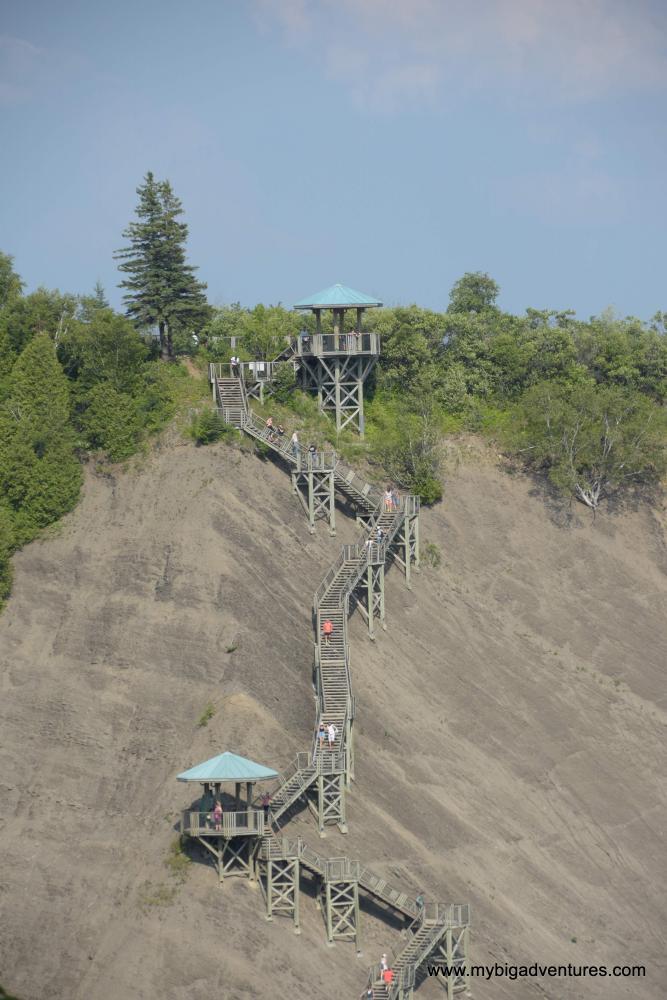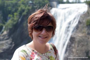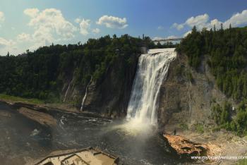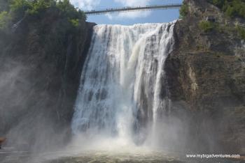The bus took about 25 minutes to reach it's final stop in Monmorency and so everyone got off. The next bit involved following a man that we thought knew where he was going... we think he did but decided on a slightly different route at the very end. It turns out the falls aren't particularly well signed, but we found them in the end anyway. We had arrived at the top of the falls on a bridge that overlooks them, and after looking for a while we wondered if that was it, but then spotted some steps leading down the side. The wooden steps weave down the side of the falls with lookout platforms dotted on the way down, it kind of looks like an Ewok village. Reaching the bottom, we walked to the edge of the platform right in front of the falls. There was a refreshing mist from all the water that was amazing to stand in given it was another really hot day, so we spent a while there enjoying it and taking a few photos.