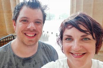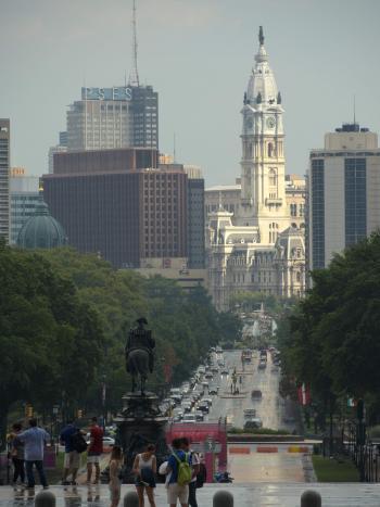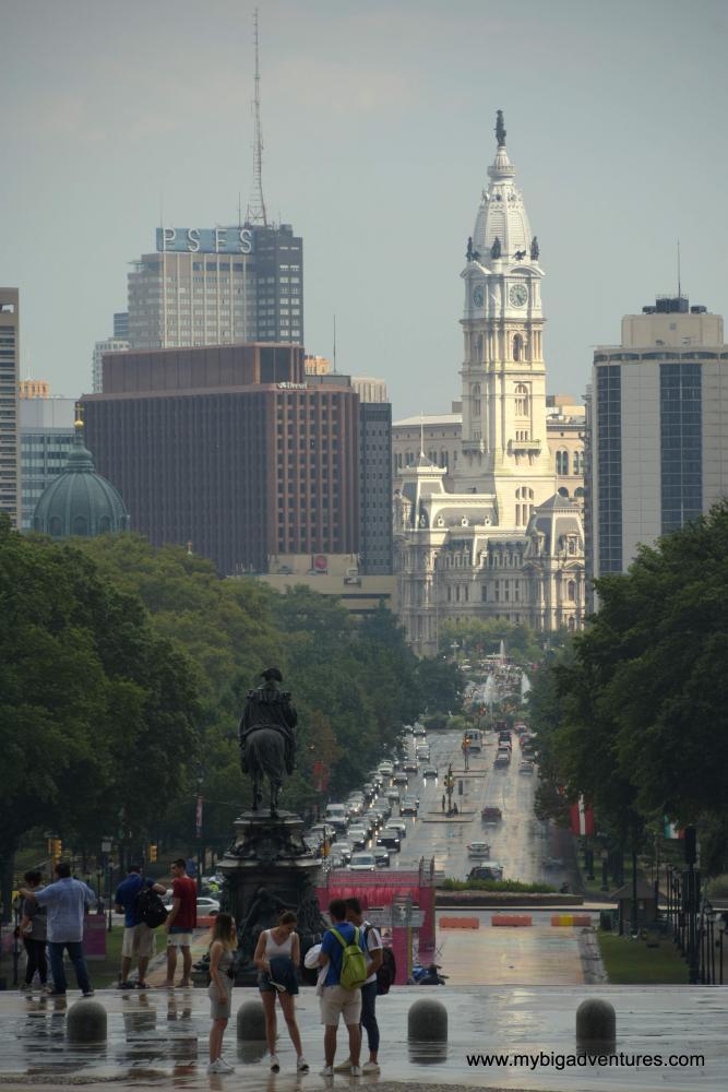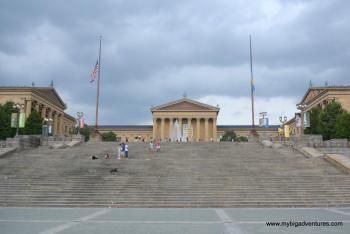 From there we wandered towards Fairmont park, immortalised because of the 'Rocky' steps that lead up to the Philadelphia museum of art that's near the bottom of the park. We walked up the steps - we could have run to be like Rocky, but no! - and had a little sit on a bench at the top. It started to rain a little bit so we had to put ponchos on but it passed over, so we 'de-ponchoed'. We decided to walk into the rest of the park and, as we were going down the steps, it started to rain again, so we 're-ponchoed'. But this time, it didn't stop. In fact, it rained more. And more. We ended up having to rush back up the steps and under the shelter of the museum, running through the flash flood water so we were pretty soaked by the time we got there. Thankfully it passed over again, so we decided to head back to the hotel. We waited for the Phlash again and were lucky to get on it before the heavens opened. It was a deluge! The bus saved us a fair bit of walking but we still had to walk a bit and the bus also stopped just before a river running down the street - so any part of our feet that weren't wet before, were certainly wet now! When we got back to the hotel, we muct have resembled drowned rats!