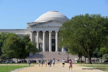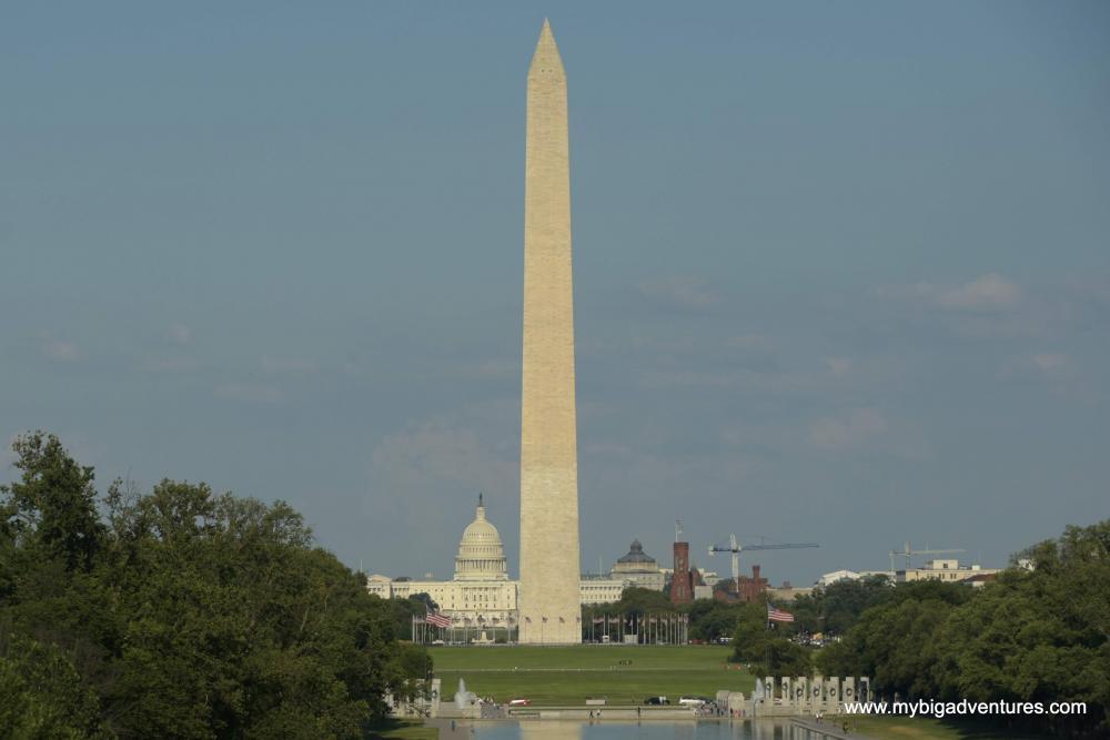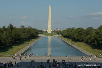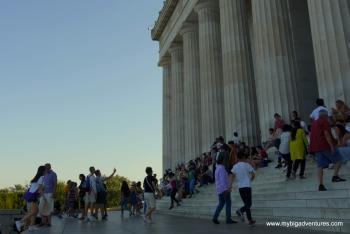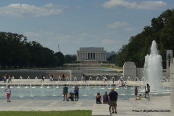 We were feeling pretty tired by the time we came out of the Air and Space museum, and after a bit of to-ing and fro-ing we decided to walk on to the Lincoln Memorial; it was still very warm and sunny, and we thought it was as good a time to go as any. It's just under 2 miles and took about 40 minutes to walk across, stopping a couple of times en route for photos. There is a large reflecting pool between the Washington Monument and the Lincoln Memorial but given the time of day, the memorial was in shadow, however once we'd climbed the steps, we were able to appreciate the monument reflecting brilliantly in the sun. We stayed for a little while, taking some photos and having a rest before heading back towards the National Mall past the WWII memorial. We were careful not to walk next to the water as last time we were here we were bitten a lot and we're only just getting rid of the bites we picked up in Philadelphia.