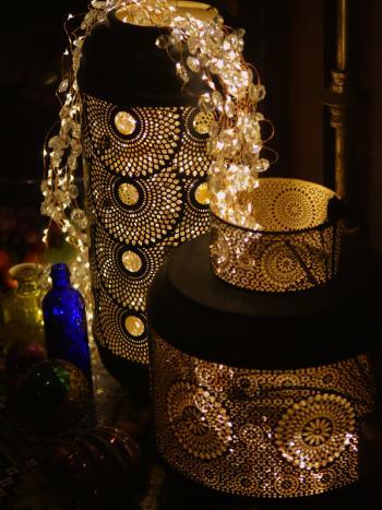 There was a short queue to get in, but the tented area in which we were waiting was decorated up with model planes and hot air balloons, so there was plenty to look at. The theme this year was "around the world in 80 days" and as travelled between each of the rooms in the house, they were decorated to represrnt a different country. The decorations were very impressive and emmersive, with particular highlights including the Moroccan room and the Chinese and Japenese rooms. There were some really pretty decorations which we had hoped to find in the shop, but although they stocked some, they didn't have some of our favourites. We managed to have a bit of a walk around the outside, down to the bottom of the lake to see the house and fountain and through the grotto. The weather initially was nice with some blue sky and sunshine, although as we started to get back towards the house, it did start to rain a little.