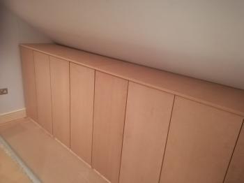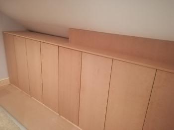 With the shelf in place, we had decided to make a back panel rather than leave it open to meet the corner of the eave, it was also hoped this may give the illusion that the storage is shallower and less intrusive in the room. We only had enough wood to make half the back panel, but as it was that took the rest of the day. It was quite a complex cut with the angle of the eave having to be trimmed from the back and the the angle at which the roof sloped along the width being taken into account, not to mention the angle when it met the wall.
